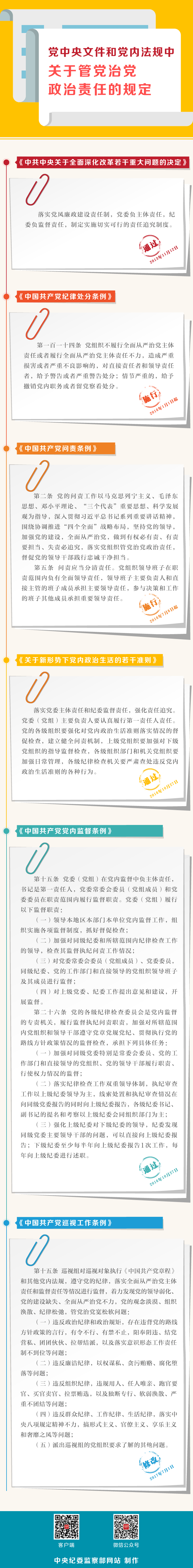 “落实党组织管党治党政治责任,督促党的领导干部践行忠诚干净担当。”2016年7月,中共中央印发《中国共产党问责条例》,首次以党内专门法规的形式对主体责任、监督责任和领导责任作了进一步明确和细化,并归纳提炼失职失责清单,为开展问责提供了明确依据和制度保障。